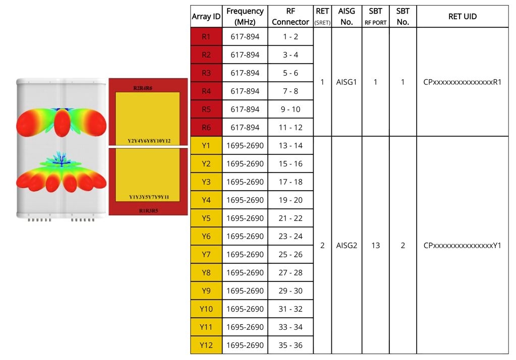 36 port multibeam ultra-high capacity antenna, 3 beams for 617-894 MHz, 6 beams for 1695-2690 MHz, 4 ports for each beam,1x RET per band