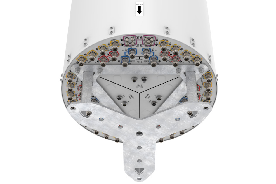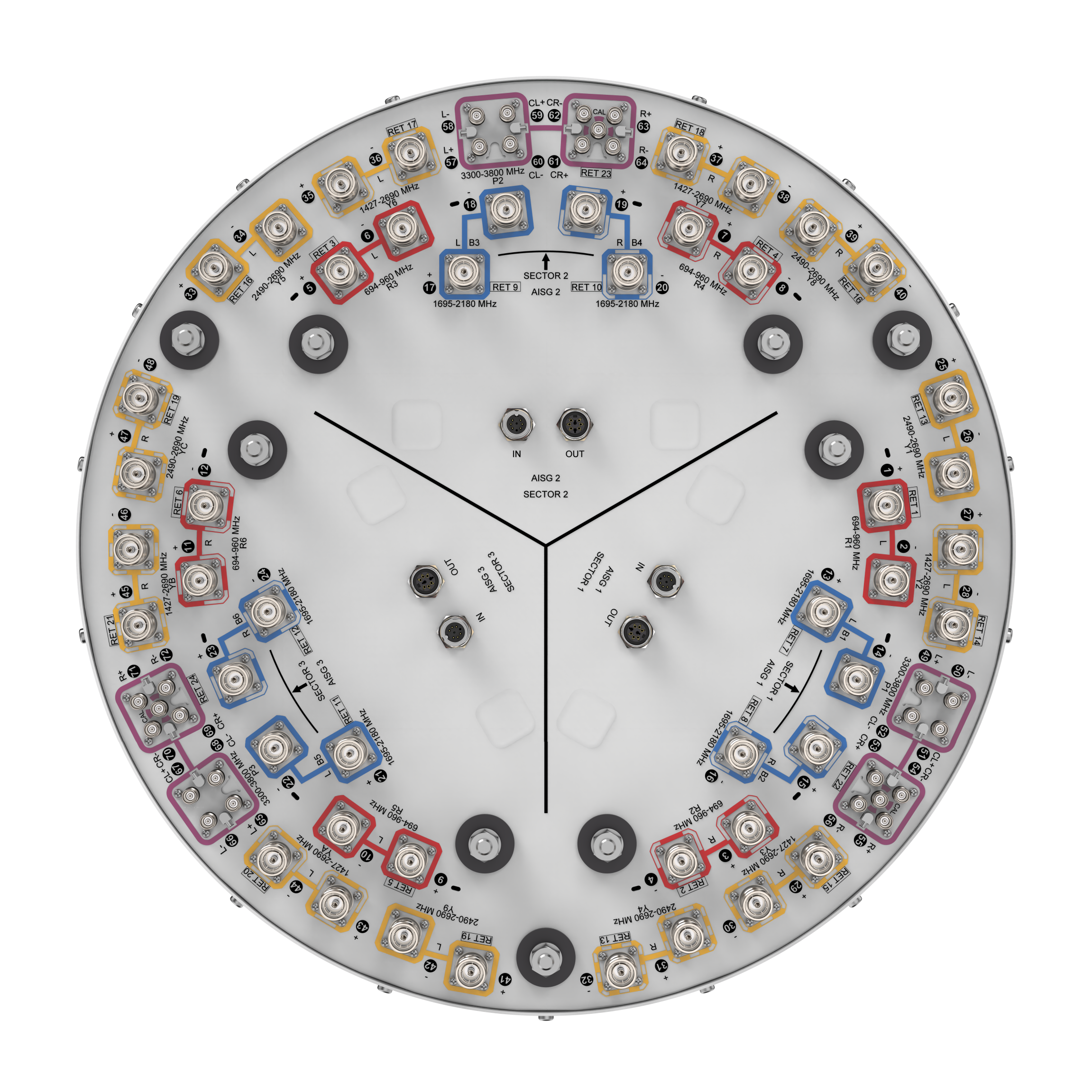 72-port sector antenna, 12x 694-960, 12x 1427-2690, 12x 1695-2180, 12x 2490-2690MHz 65° HPBW and 24x 3300-3800 MHz, 90° HPBW, 24x RET