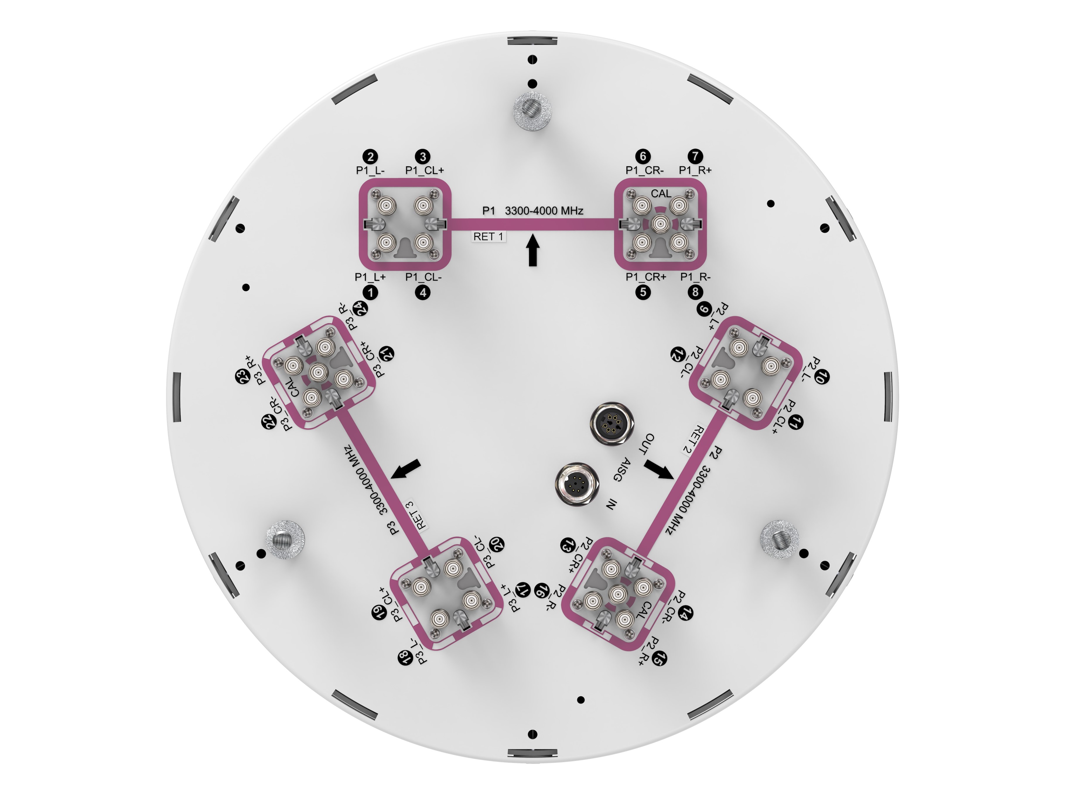 24-port tri-sector Antenna, 3 planar arrays pointing 0-120-240 degrees, 3300–4000 MHz, 90° HPBW, 3x RET