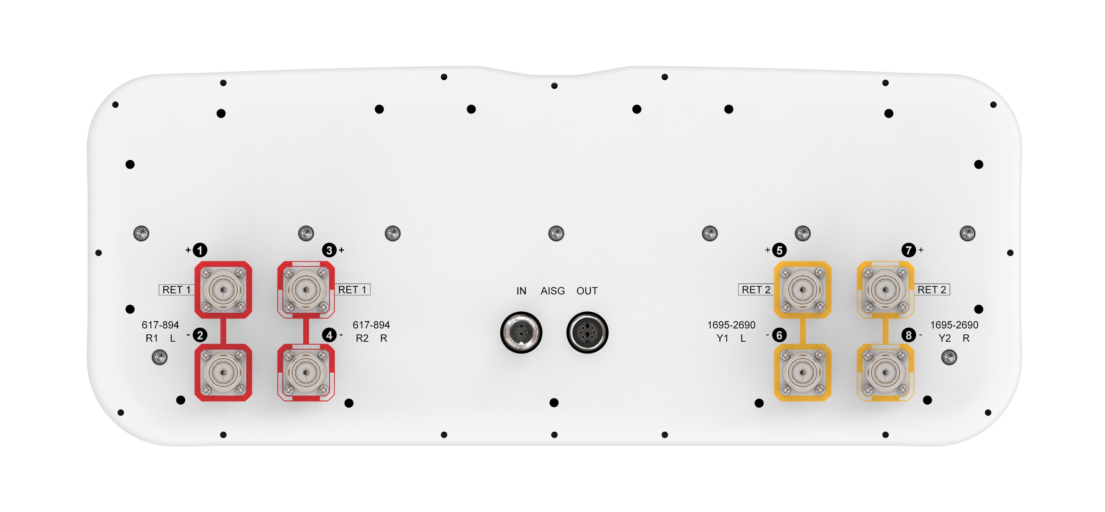 - Antenna includes 2×Single Column X-Pol Arrays for 617-894MHz and 2×Single Column X-Pol Arrays for 1695-2690MHz