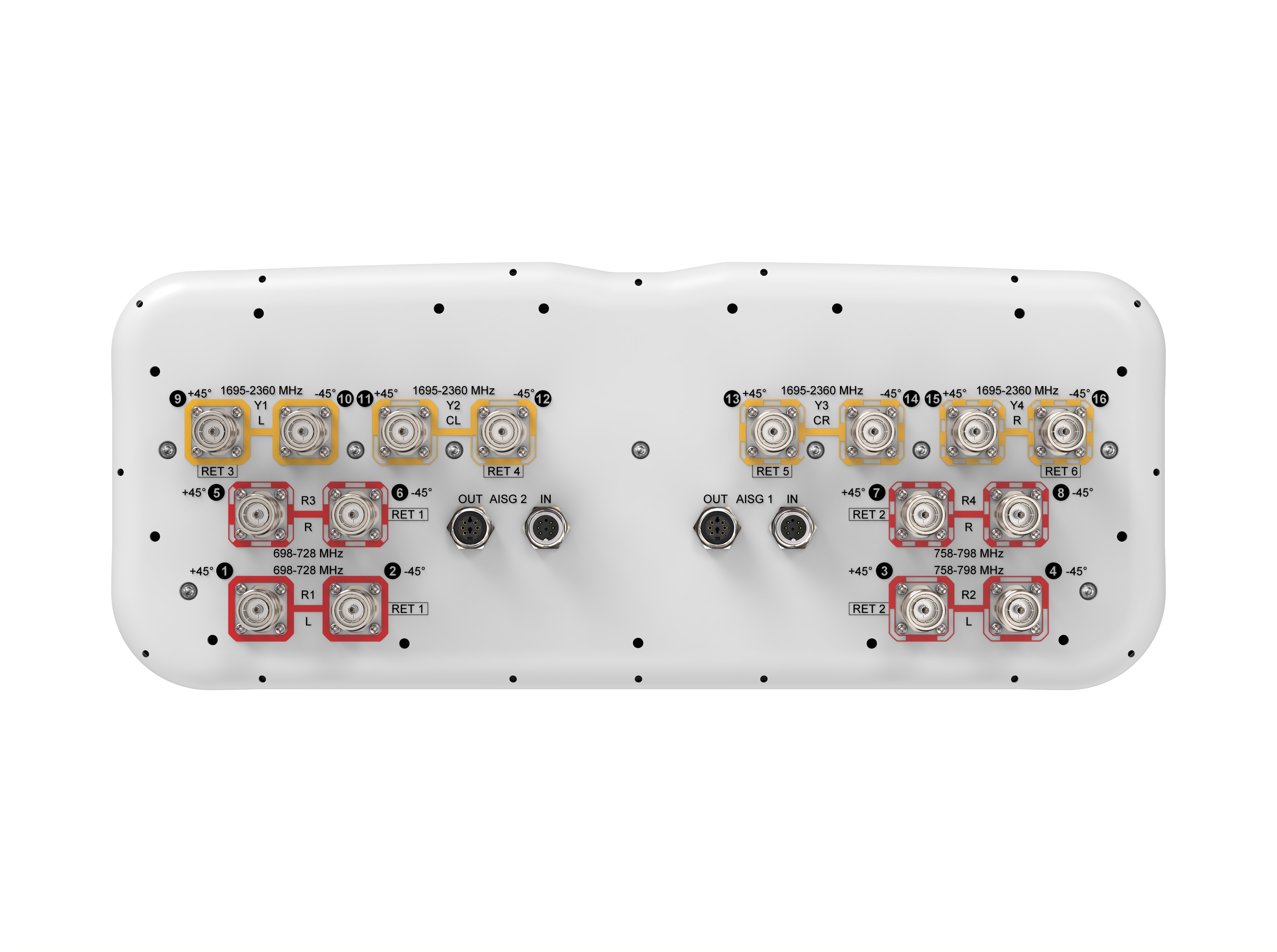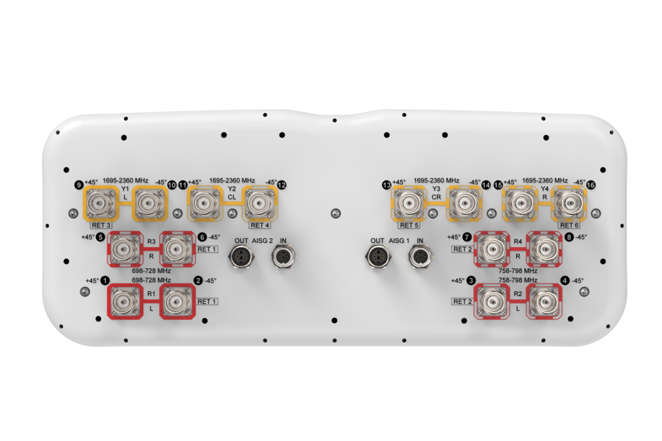 16-port, low band diplexed antenna, 4x 698-728 MHz, 4x758-798 MHz and 8 x 1695-2360 MHz, 65° HPBW, 6 x RET