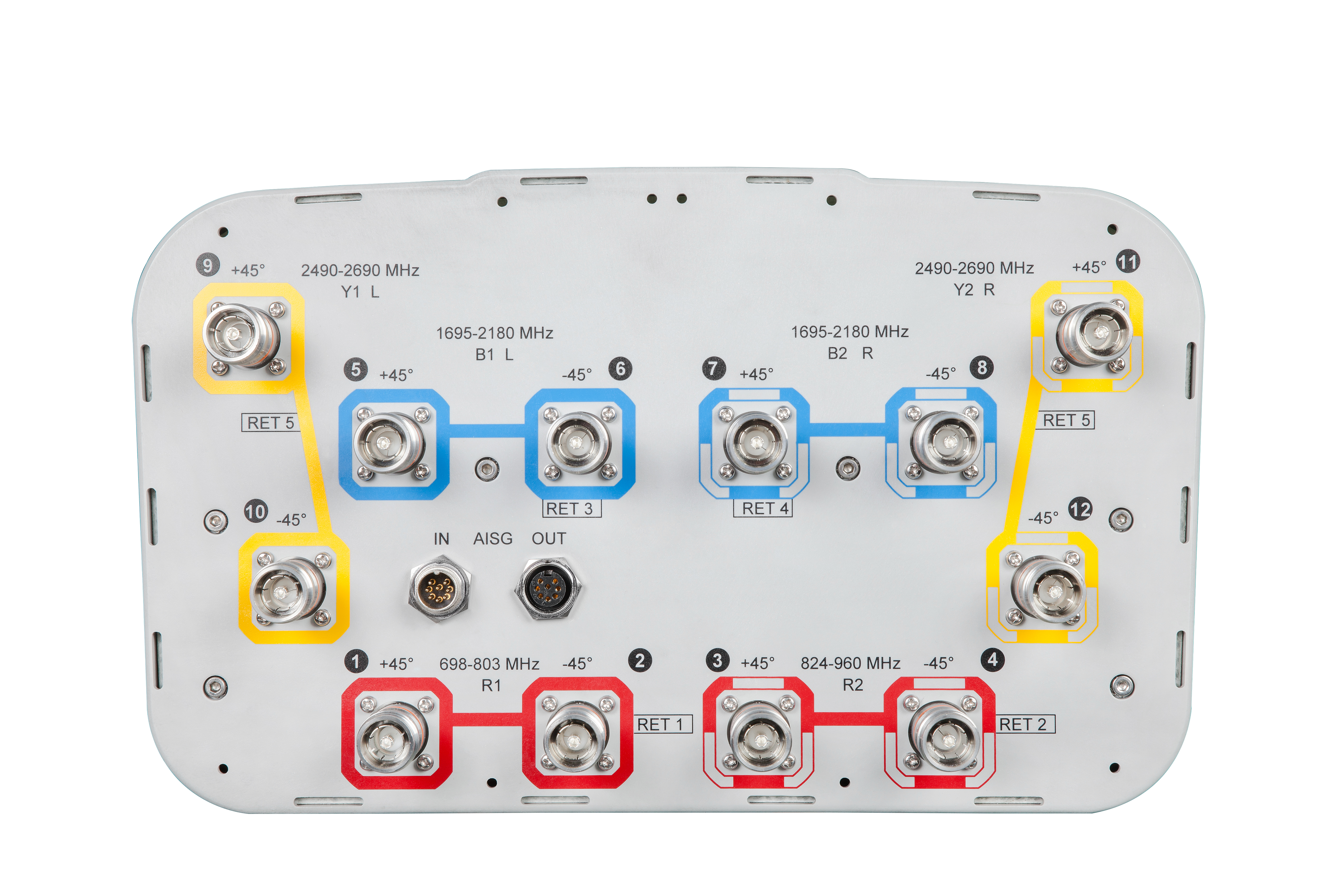 12-port sector antenna, 2x 698–803, 2x 824–960, 4x 1695–2180 and 4x 2490-2690 MHz, 65° HPBW, 5x RET. 2500MHz arrays share the same motor.