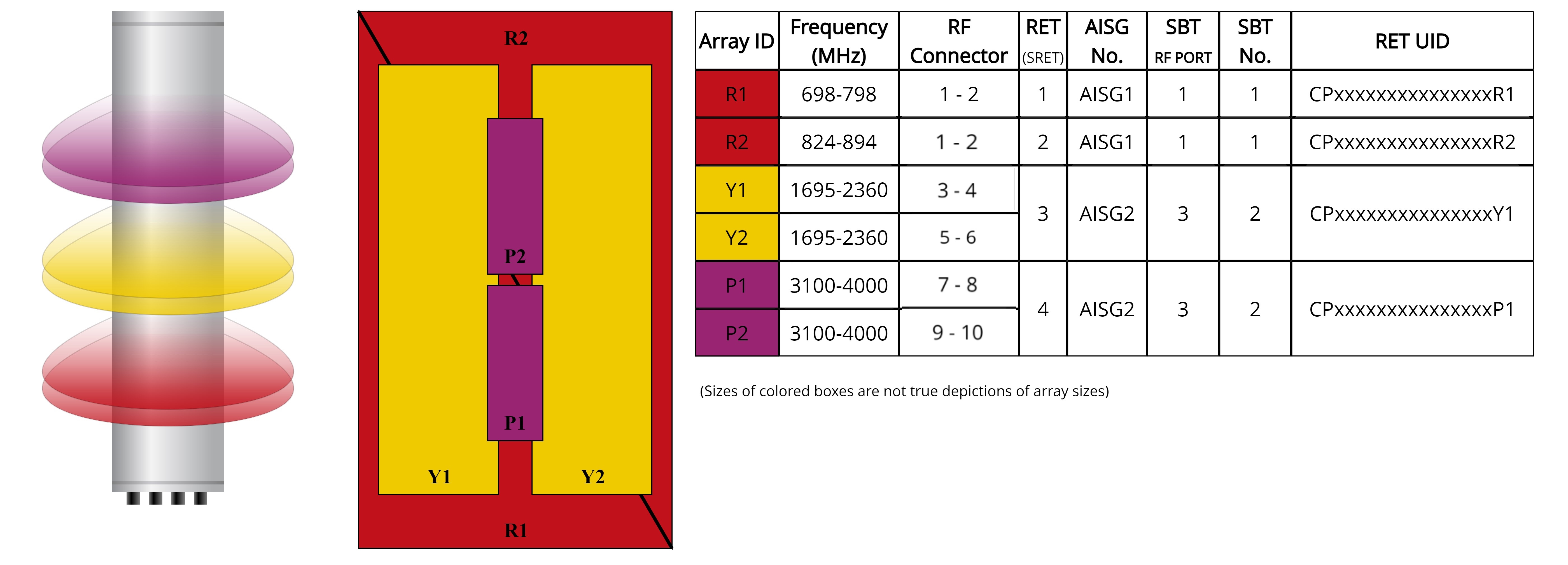 • Two LB RET and one MB RET. Both mid bands are controlled by one RET to ensure same tilt level for 4x MIMO
