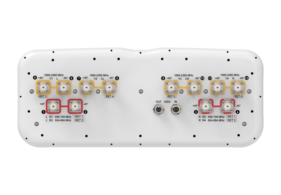 12-port sector antenna, 4x 698-894 and 8x 1695-2360 MHz, 65° HPBW, 6x RET.