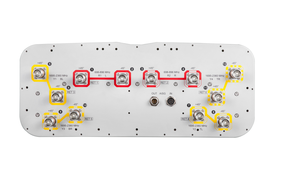 - Features broadband Low Band (698-896 MHz) and High Band (1695-2360 MHz) arrays for 4T4R (4X MIMO) capability for Band 14, AWS, PCS and WCS applications
