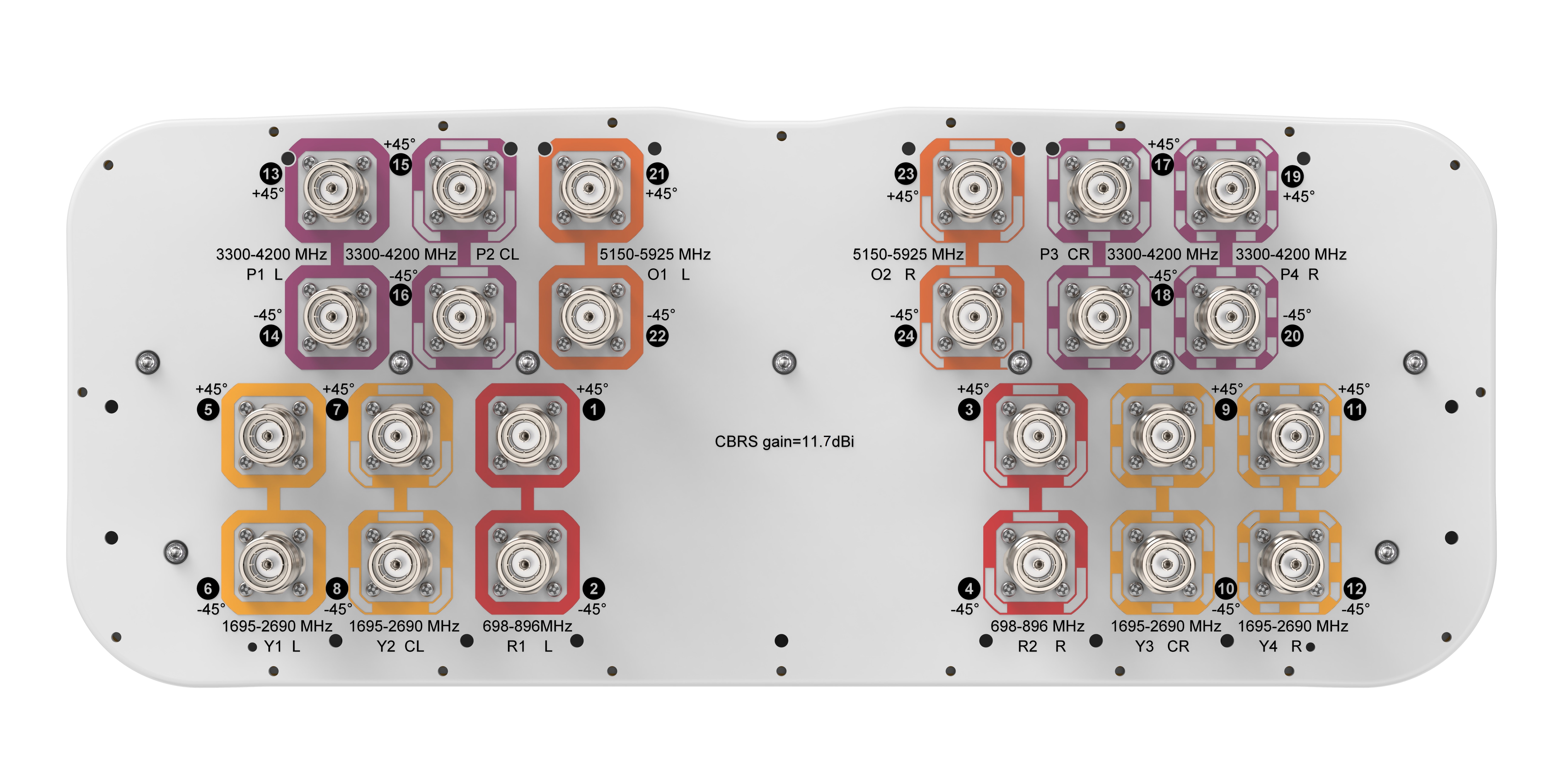 24-port, 4x 698-896MHz, 8x 1695-2690MHz, 8x CBRS, 4x LAA, 65°, 2 ft, 4deg fixed tilt for 698-896MHz and 1695-2690MHz, 0deg fixed tilt for 3300-4200MHz and 5150-5925MHz