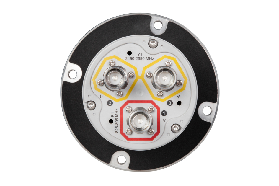 3-port omni antenna, 1x 825-896 and 2x 2490–2690 MHz, low band vertical polarization and high band horizontal/vertical polarization, 360° horizontal beamwidth