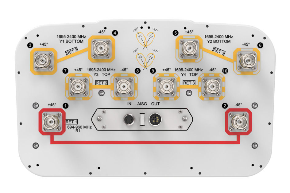 10-port sector/multibeam antenna, 2x 694–960 sector and 8x 1695–2400 multibeam, 65° sector and 33° 4x multibeam, 3x RET