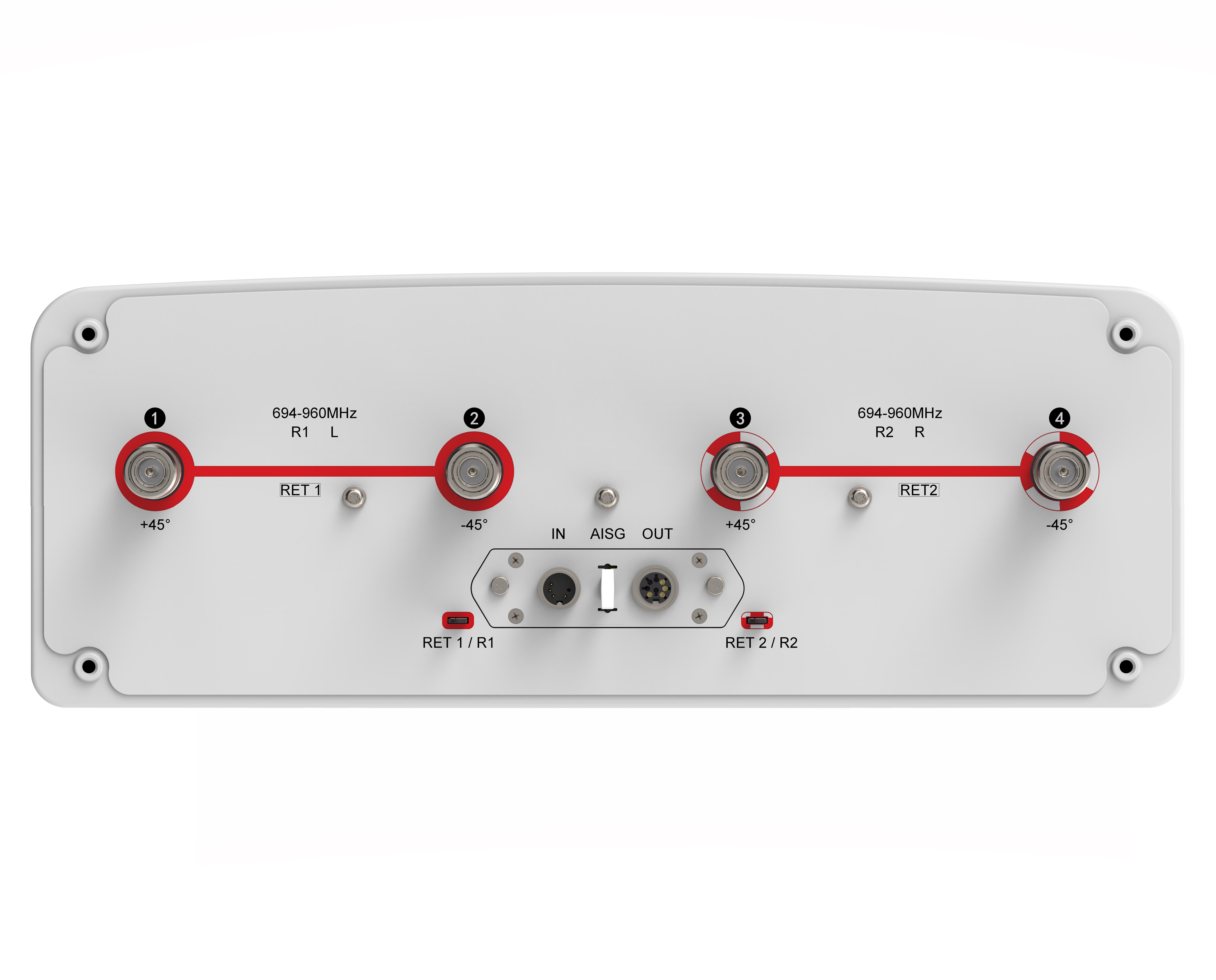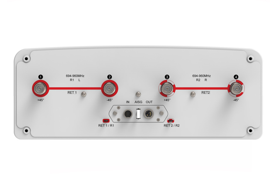 4-port sector antenna, 4x 694–960 MHz, 65° HPBW, 2x RET