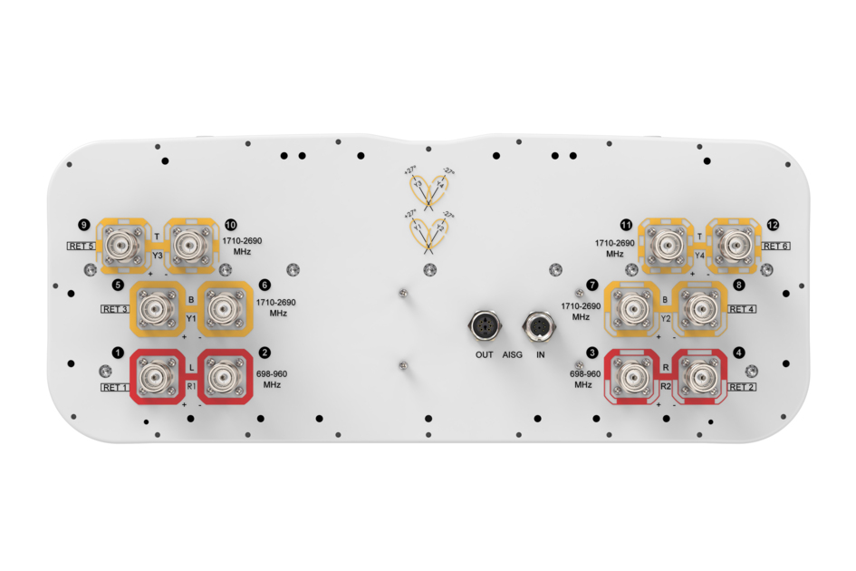 12-port sector/multibeam antenna, 4x 698–960 MHz 65° HPBW and 8x 1710–2690 MHz 4x 33° HPBW, 6x RET