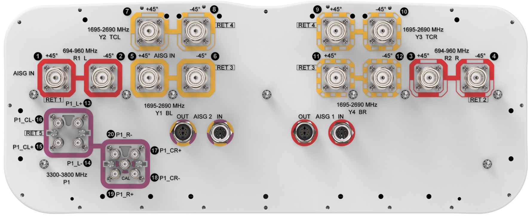 20-port sector antenna, 4x 694–960, 8x 1695–2690 MHz, 65° HPBW and 8x 3300-3800 MHz, 90° HPBW, 5x RET