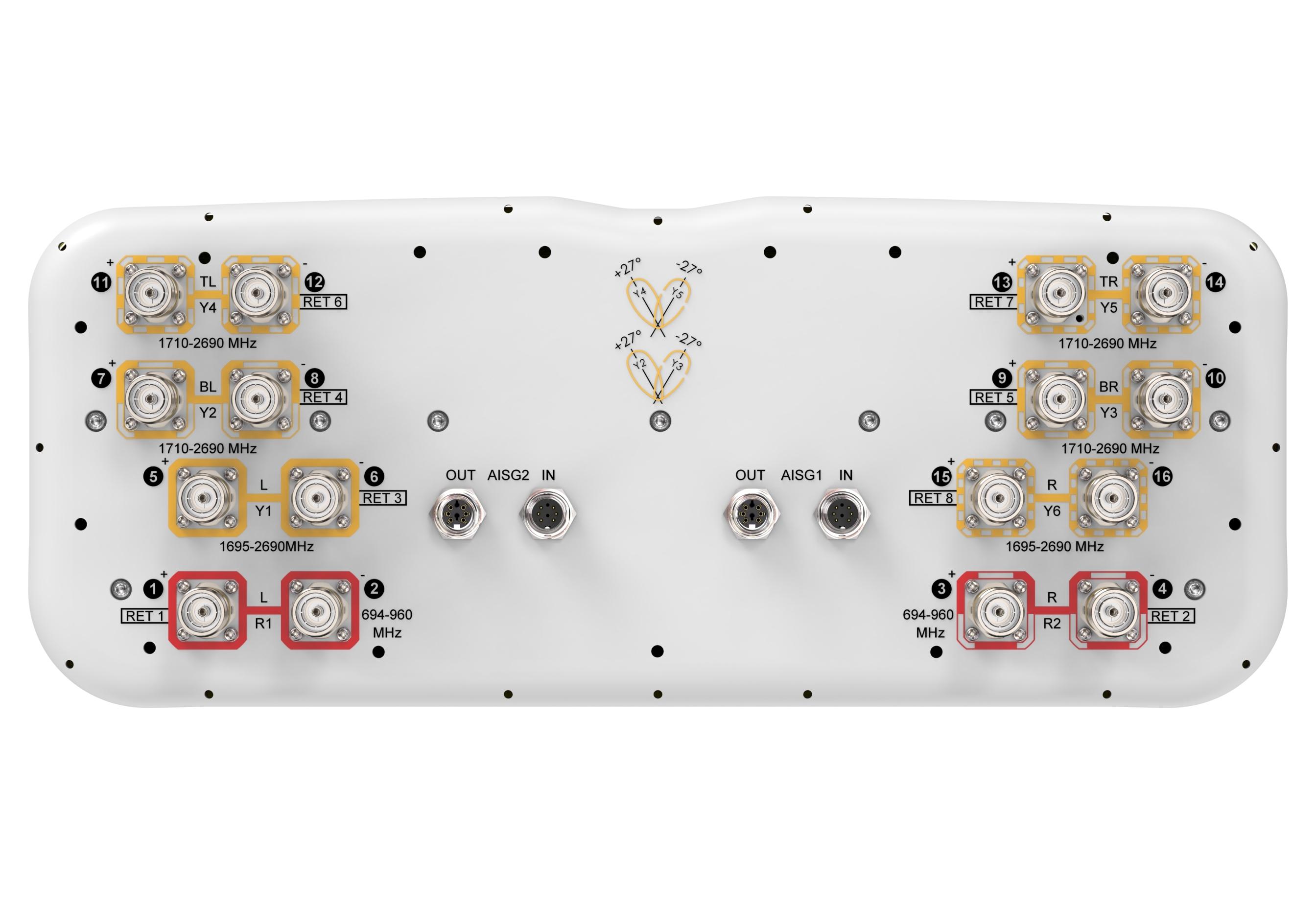 16-port sector/multibeam antenna 4x 694–960 MHz, 4x 1695-2690 MHz 65° HPBW and 8x 1710–2690 MHz 2x 2-Beam 33°HPBW, 8x RET