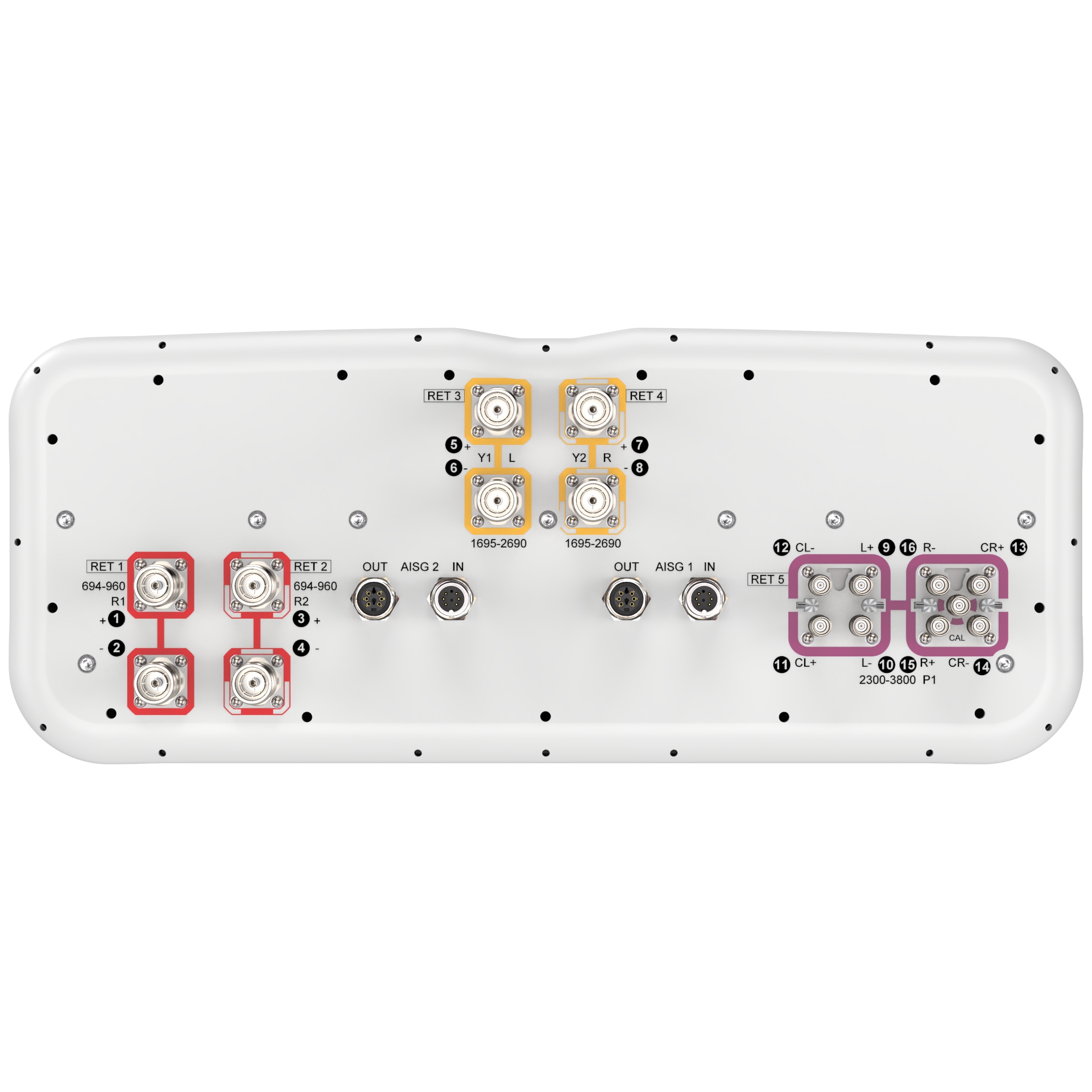 16-port sector antenna,4 x 694-960 MHz (R1-R2), and 4 x 1695-2690 MHz (Y1-Y2) 65° HPBW, 8 x 2300-3800 MHz (P1), 90° HPBW, 5 x RET