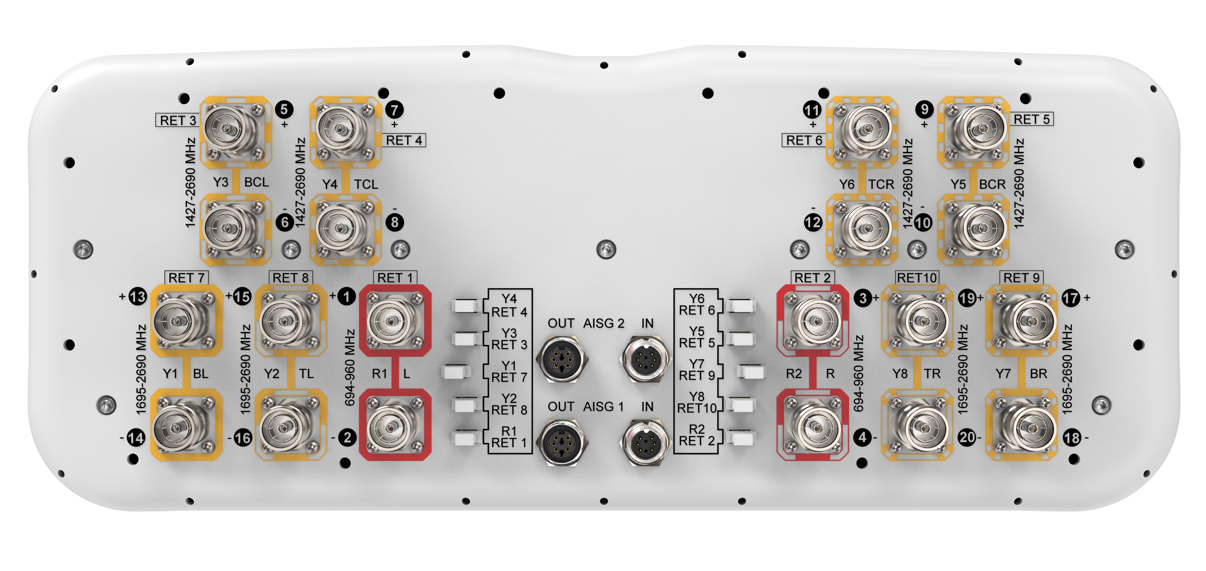 20-port sector antenna, 4x694-960 (R1 & R2), 8x1427-2690 (Y3-Y6) and 8 x 1695-2690 MHz (Y1/Y2/Y7/Y8), 65° HPBW, 10xRET