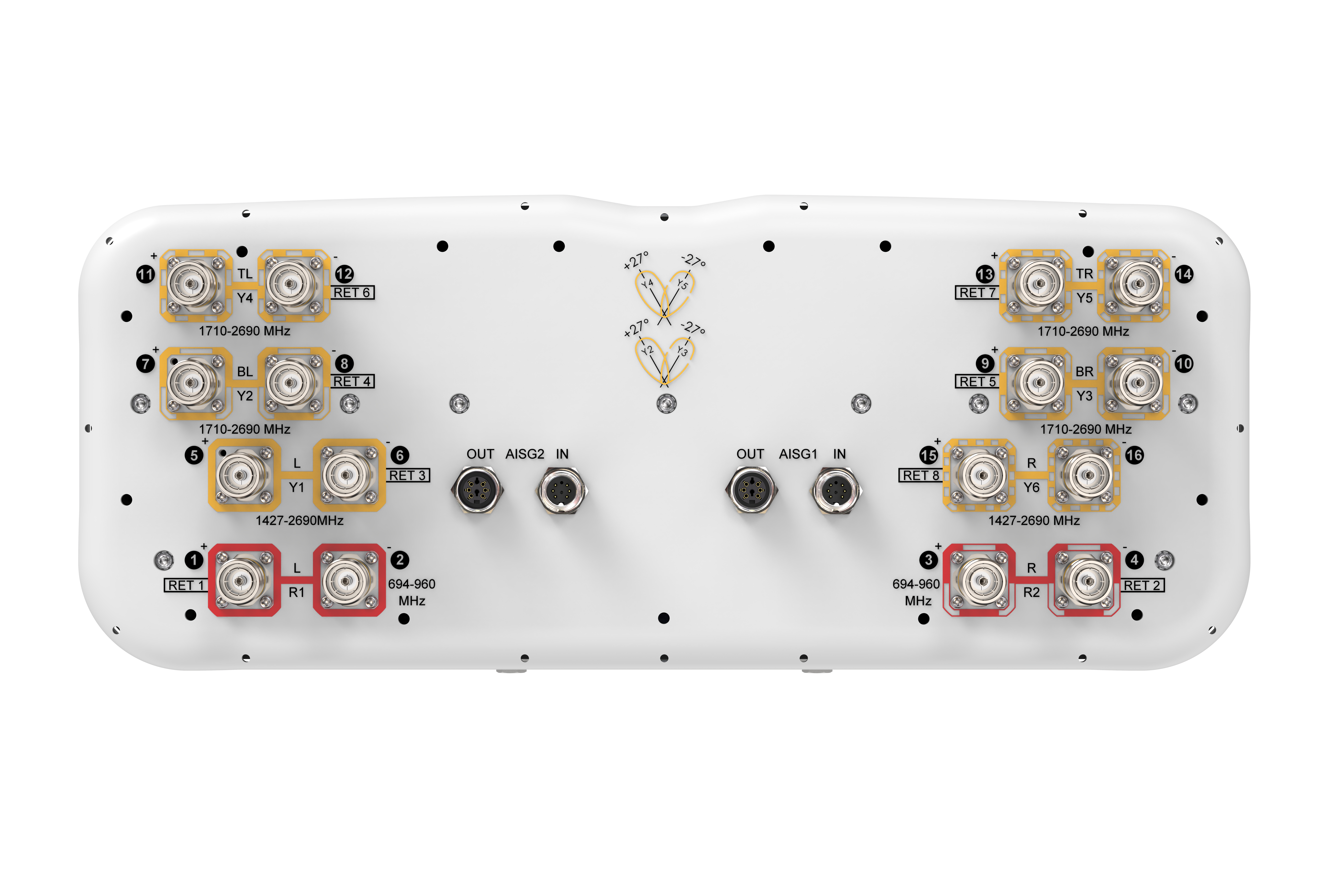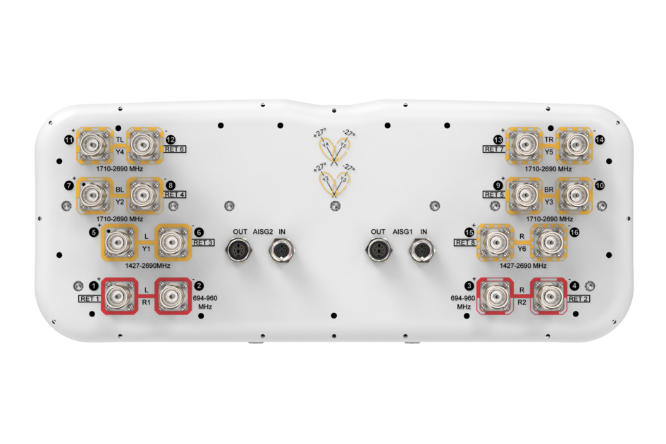 16-port sector/multibeam antenna 4x 694–960 MHz, 4x 1427-2690 MHz 65° HPBW and 8x 1710–2690 MHz 2x 2-Beam 33°HPBW, 8x RET
