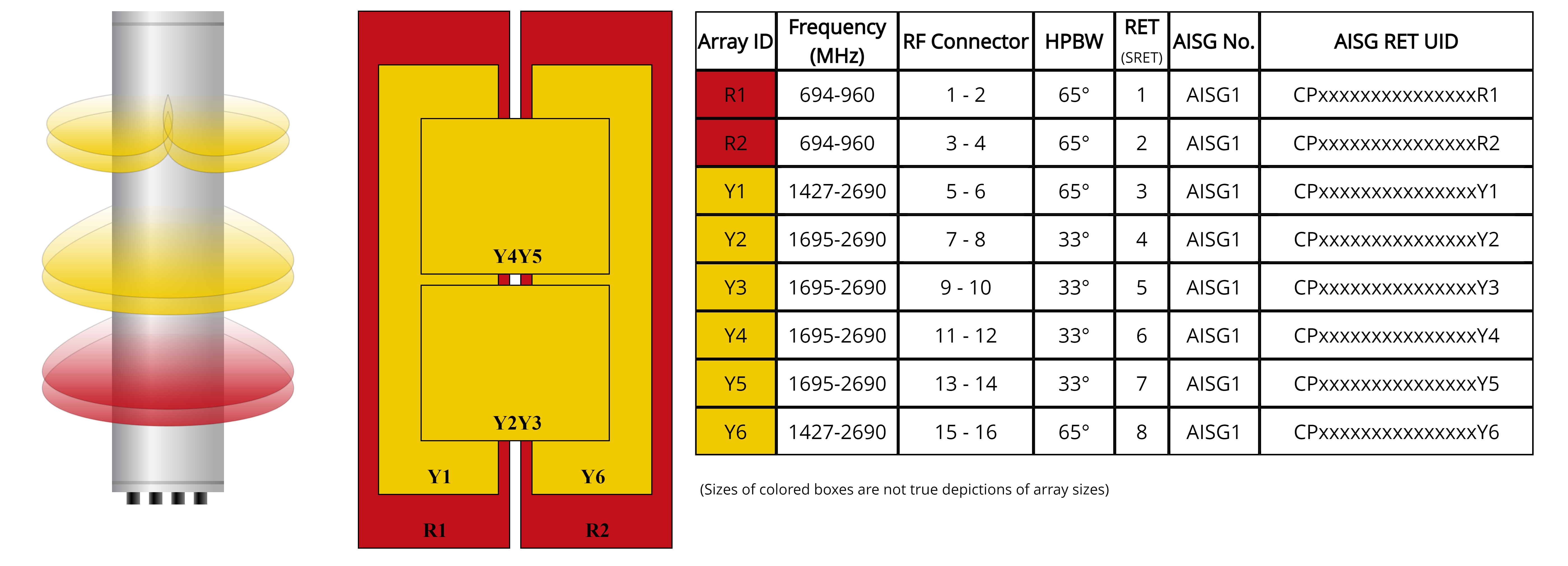 16-port sector/multibeam antenna 4x 694–960 MHz, 4x 1427-2690 MHz 65° HPBW and 8x 1695–2690 MHz 2x 2-Beam 33°HPBW, 8x RET