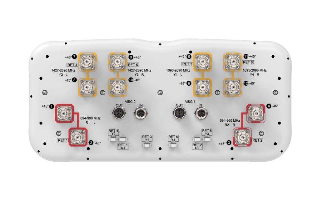 12-port sector antenna, 4x 694–960, 4x 1427–2690 and 4x 1695-2690 MHz, 65° HPBW, 6x RET