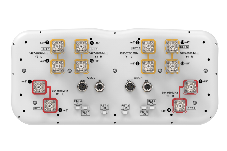 12-port sector antenna, 4x 694-960,4x 1427–2690 and 4x 1695- 2690 MHz, 65° HPBW, 6x RET