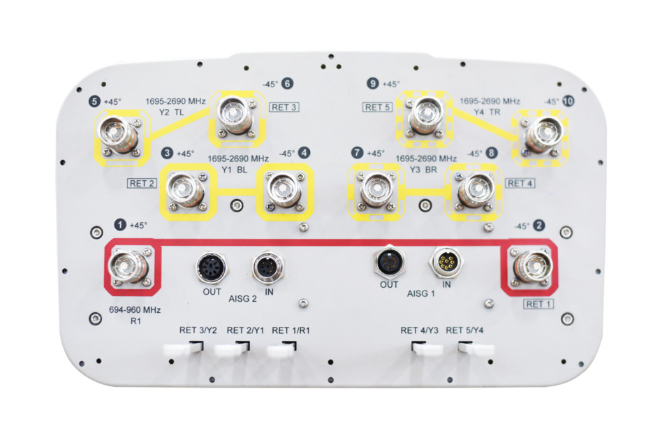 • Supports re-configurable antenna sharing capability enabling control of the internal RET system using up to two separate RET compatible OEM radios (Supports_r)