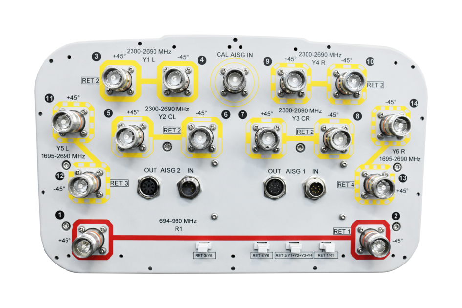 14-port sector antenna, 2x 694–960, 4x 1695-2690 and 8x 2300–2690 MHz, 65° HPBW, 4x RET
