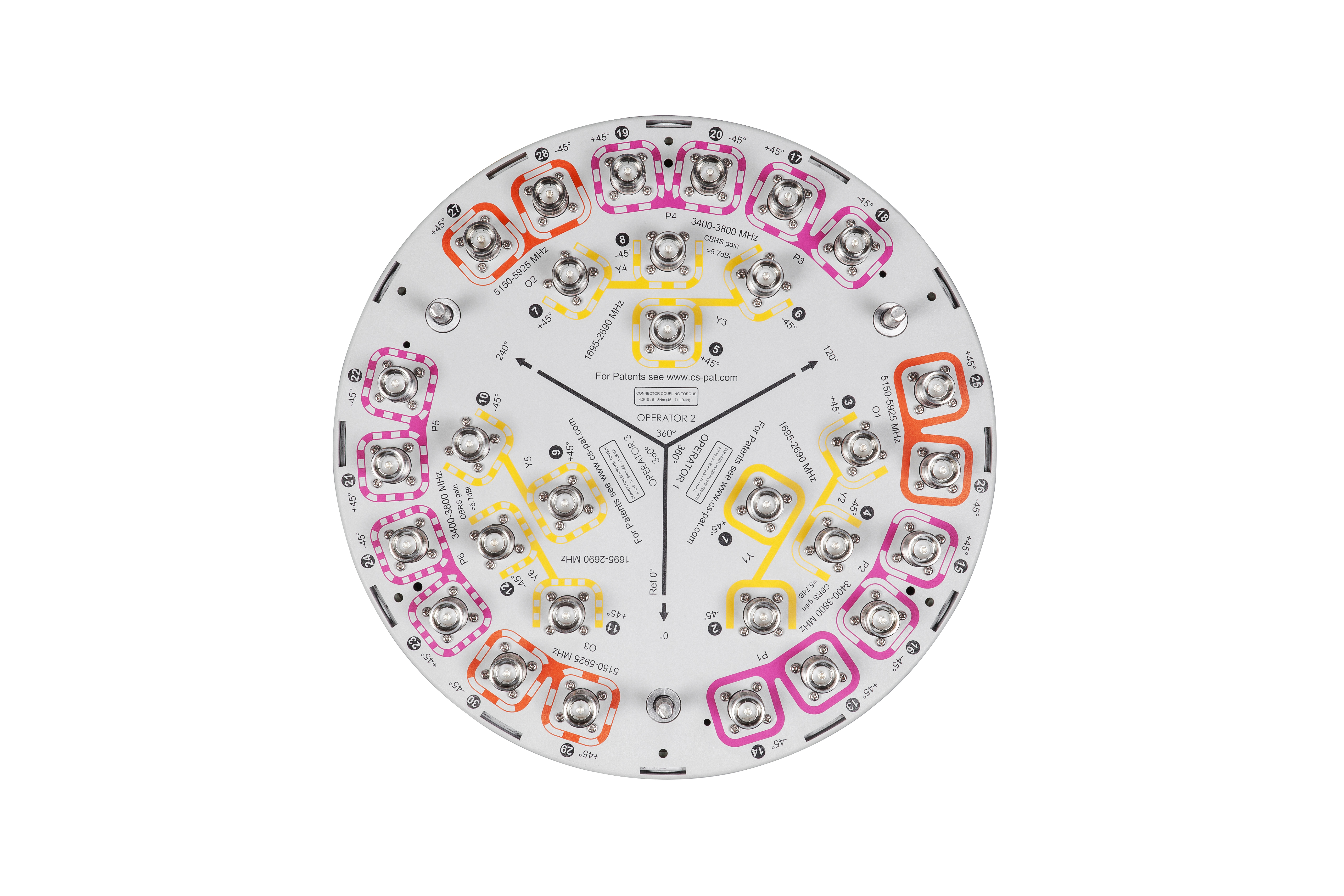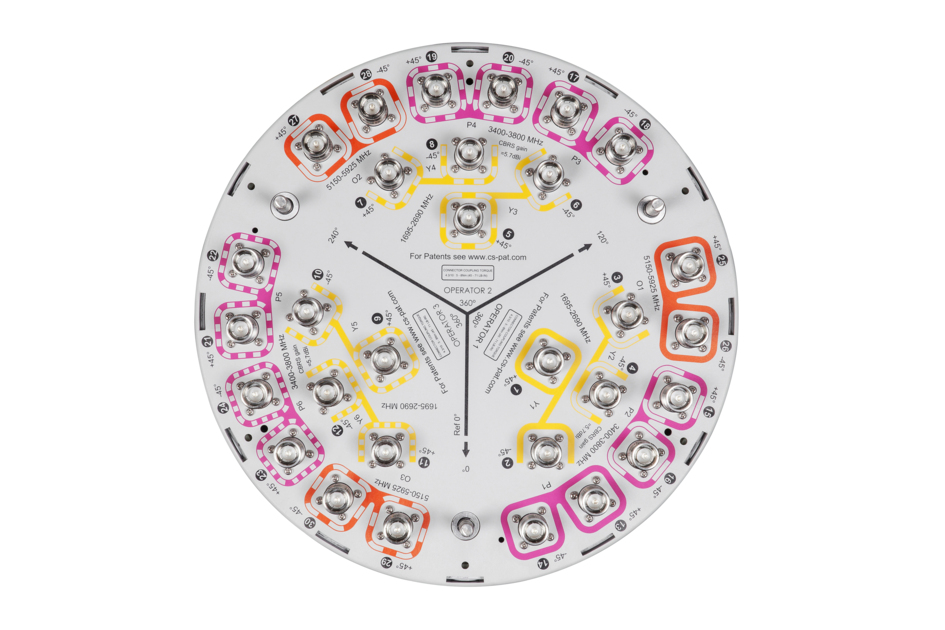 30-port small cell antenna, 12x 1695–2690, 12x 3400-3800 and 6x 5150-5925 MHz. 360° Horizontal Beamwidth, fixed tilt.