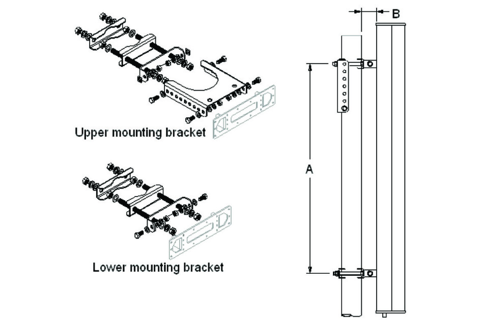 Adjustable Tilt Pipe Mounting Kit for 2.362"-4.5" (60-115mm) OD round members for panel antennas. Includes 2 clamp sets.