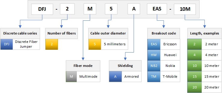 HELIAX® Discrete, 2 multimode fiber, 5 mm LSZH cable. End 1: DLC. End 2: DLC