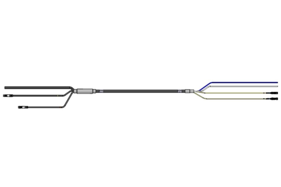 HELIAX® Hybrid Cable Assembly, Aluminum armored cable. 2x6mm2 power conductor (Class 5) White/Blue, 4xSingle Modefiber. End 1: 6.0mm branch cable terminated with Uni-boot LC. And 2x6mm2 power conductor terminated with Molex Crimp sleeve, separate package the RECEPTACLE. End 2: 3.0mm branch cable terminated with Uniboot LC and blunt cut power cable end 1 Power cable OD=14.9+/-1mm, and End 2 conductor sheath OD=4.5mm.