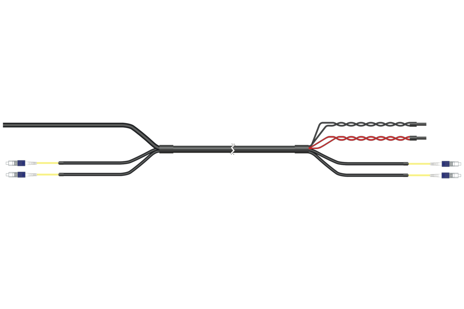 HELIAX® Hybrid Cable Assembly, BiDi, 6-OVP box to RRU, UL Type TC-ER, 4 power conductors 10 AWG at OVP, 1 power cord 8 AWG at RRU, 2 Simplex fiber connectors, PVC jacket, aluminum armor, OVP gland insert kit included