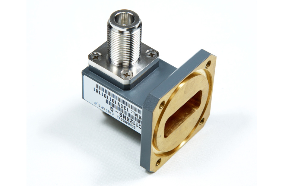 Waveguide/Coaxial Cable Transition for WR90, 8.2–12.4 GHz, with interface types N Female and PDR100, gray