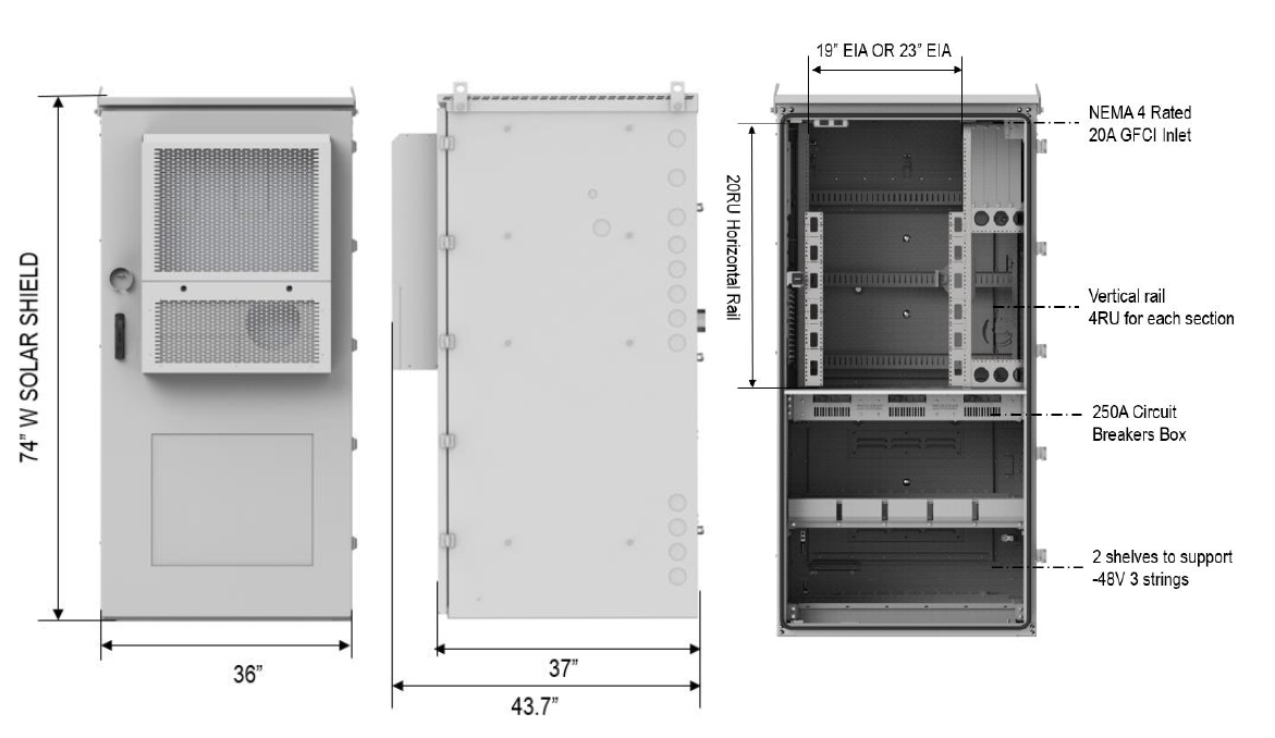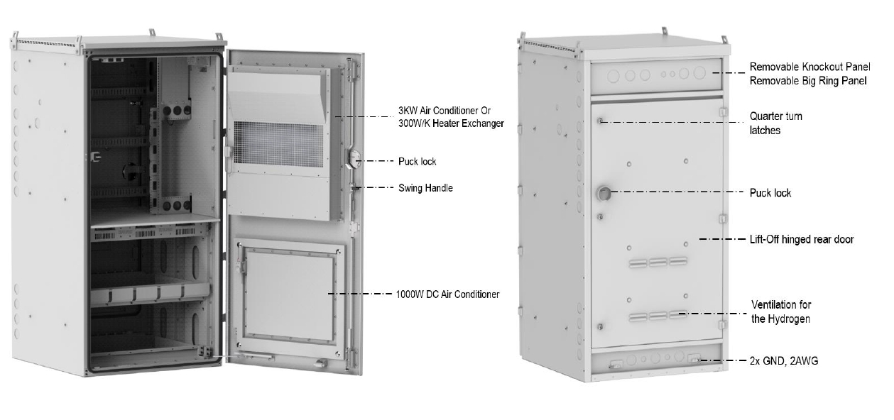 The cabinet is designed to combine wireless telecom power equipment and NiCad batteries into one cabinet. Equipment ranges from DC power system, Fiber slack tray, cell site router and other servers equipped by customer. This cabinet provide mechanical and environmental protection for the equipment inside. Cooling of active equipment is achieved by DC rated 3000W Air Conditioner.