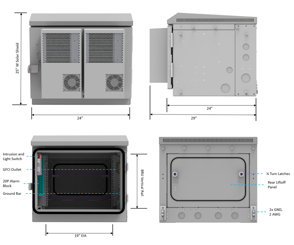 The CMC8S is a durable, weather-resistant cabinet designed to protect and support rack-mounted equipment in demanding environments. Tailored for telecom and networking applications, it accommodates a wide range of components including DC power systems, fiber trays, routers, batteries, and more. Includes LED light, 20 position alarm block, door intrusion alarm, GFCI duplex outlet and ground bus bar.