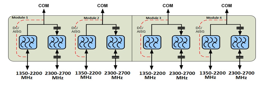 Quad Diplexer 1350-2200/2300-2700 MHz, DC bypass on 1350-2200 ports, 4.3-10 connectors