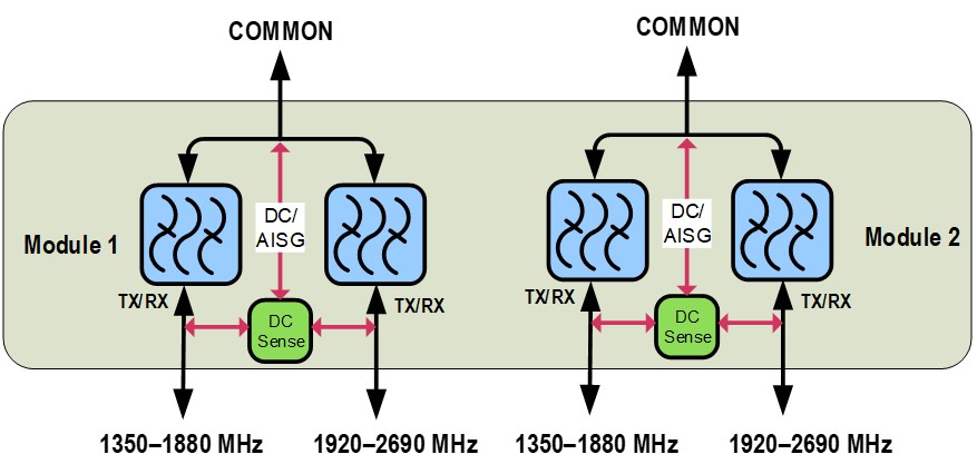 Twin Diplexer, 1325-1880/1920-2690, dc/AISG Smart bypass functionality, with 4.3-10 connectors