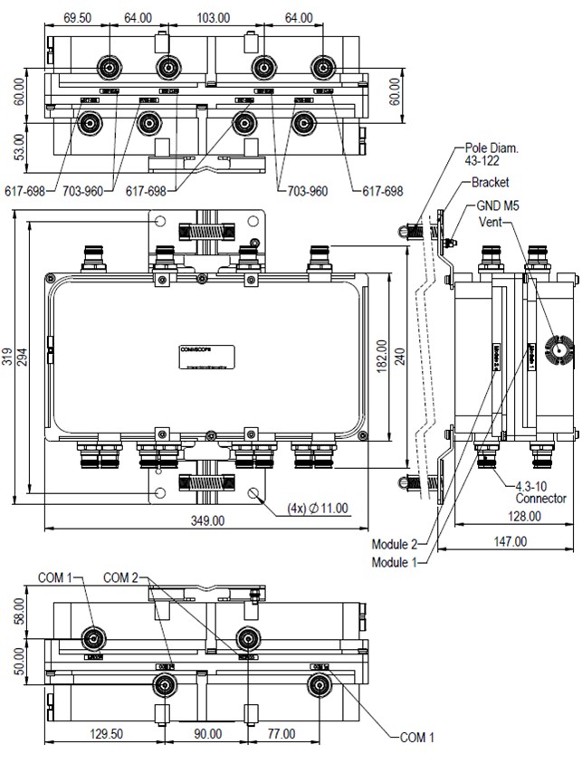 Quad Diplexer 617-698/703-960 MHz, 4.3-10 connectors