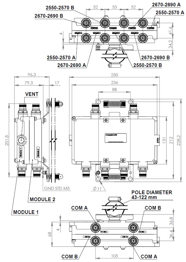 Ultra Compact Quad Diplexer, 2550–2570/2670–2690 MHz, DC Block, with 4.3-10 connectors