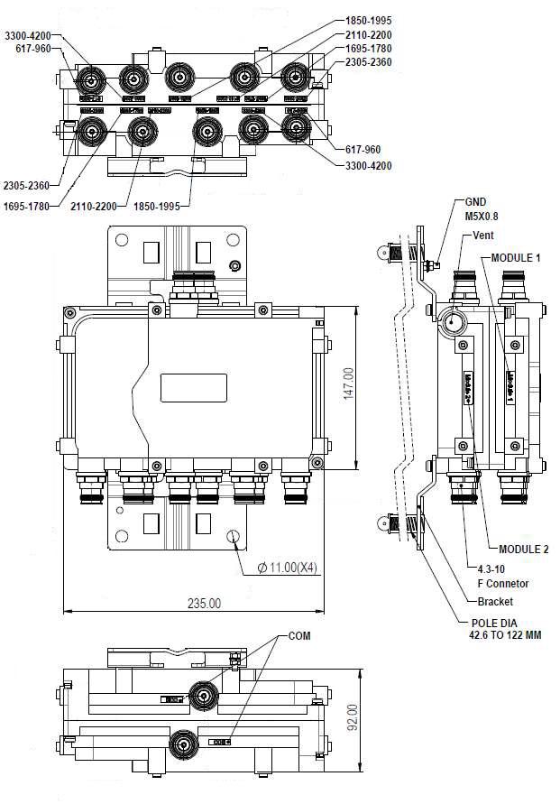 Compact Twin Pentaplexer 617-960/AWS/PCS/WCS/ 3.3-4.2G, dc bypass on low ports, with 4.3-10 connectors