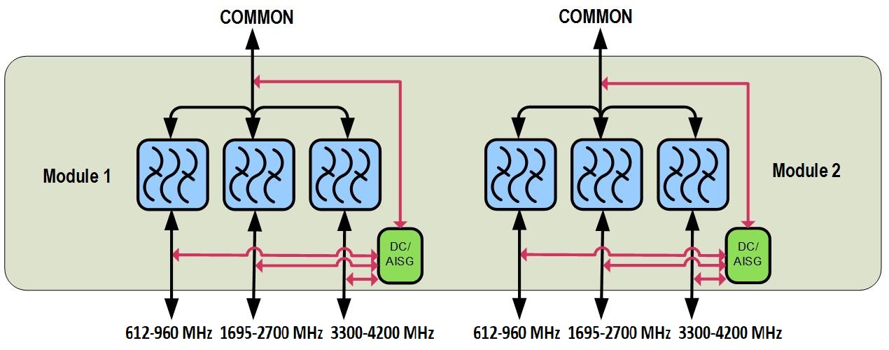 Twin Triplexer, 612-960/1695-2700/3300- 4200 MHz, 4.3-10 connectors, DC Sense
