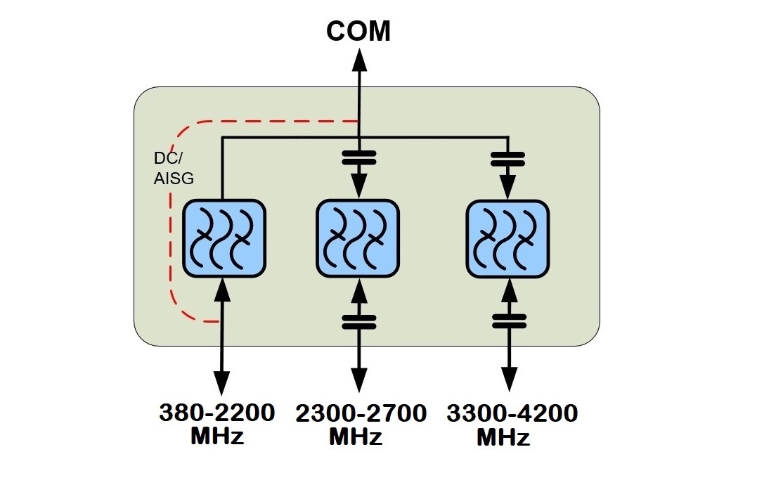 Compact Single Triplexer 380-2200/2300-2700/ 3300-4200 MHz, 4.3-10 connectors