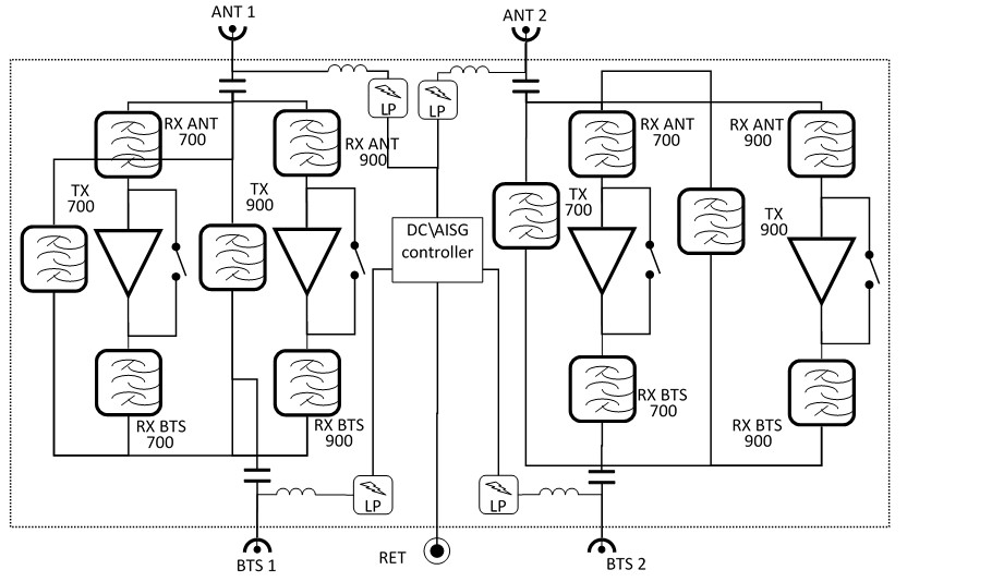 Dual Band Tower Mounted Amplifier, 700//900 MHz, 12 dB, 2 BTS & 2 ANT ports, AISG with 1 RET connector (1 device with 2 sub-units), with 4.3-10 connectors
