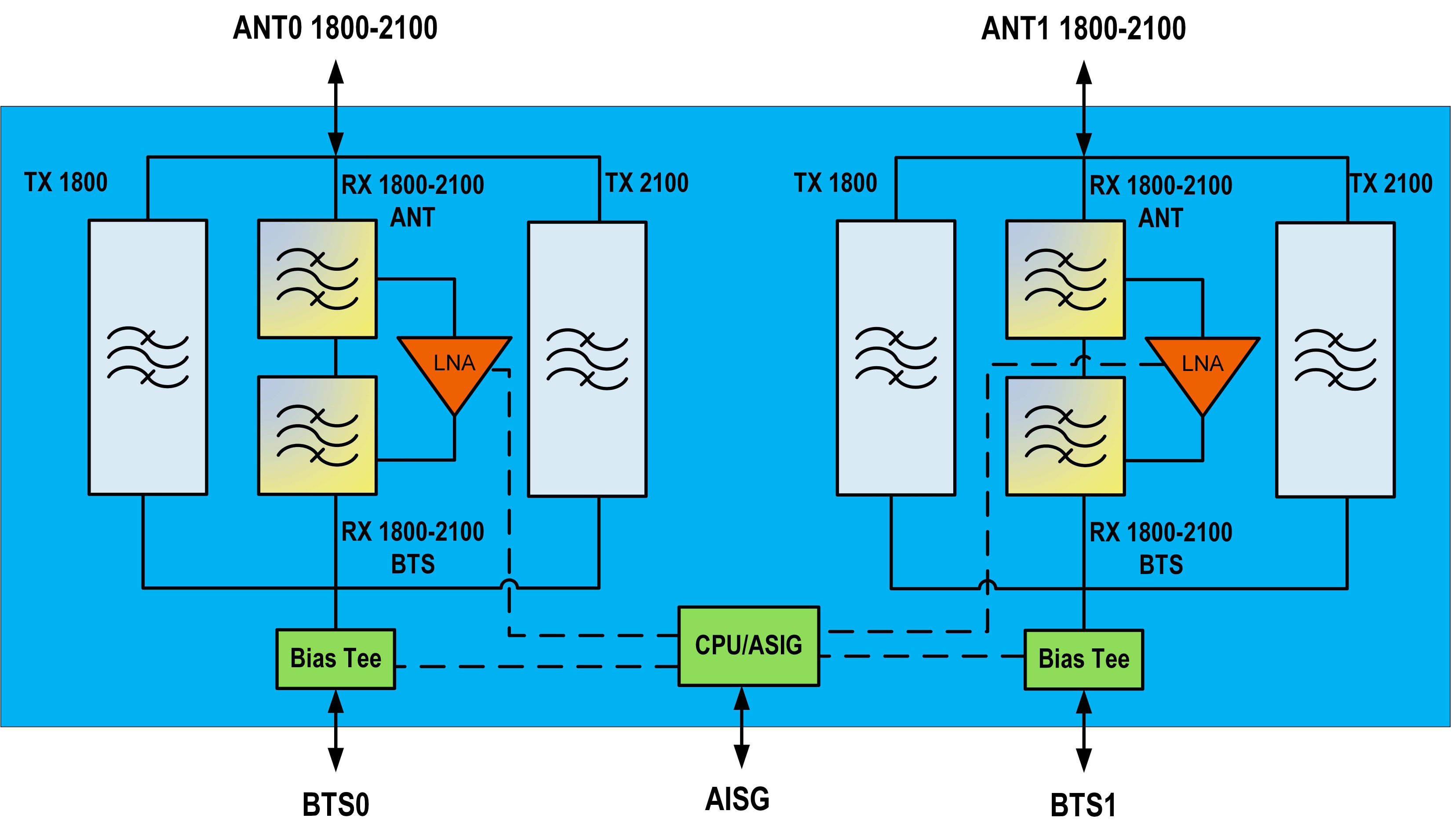 Dual Band Tower Mounted Amplifier, 1800//2100 MHz, 12 dB, 2 BTS & 2 ANT ports, AISG with 1 RET connector (1 device with 2 sub-units)
