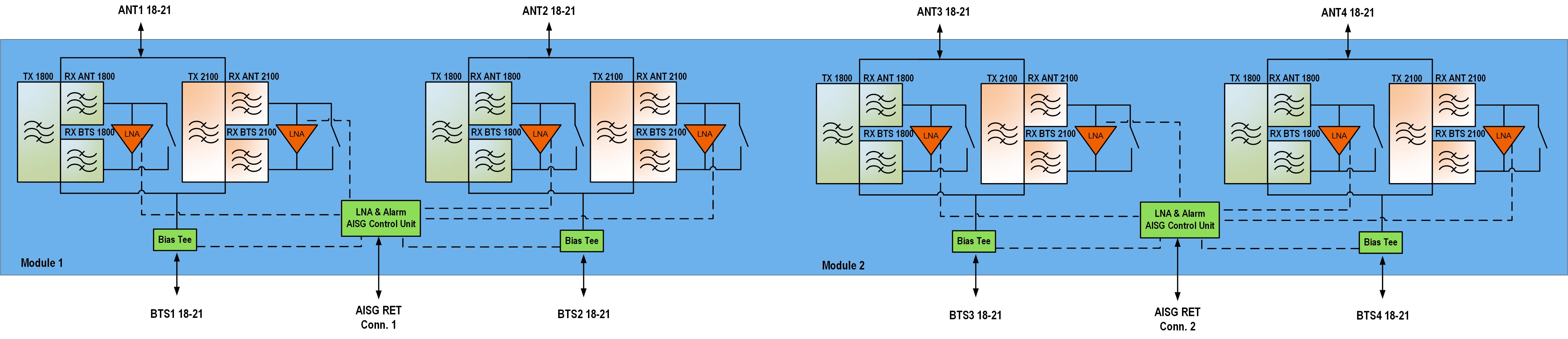 Quad Dual Band Tower Mounted Amplifier, 1800//2100 MHz, 12 dB, 4 BTS & 4 ANT ports, AISG with 1 RET connector per TMA (2 device with 2 sub-units each) with 4.3-10 connectors