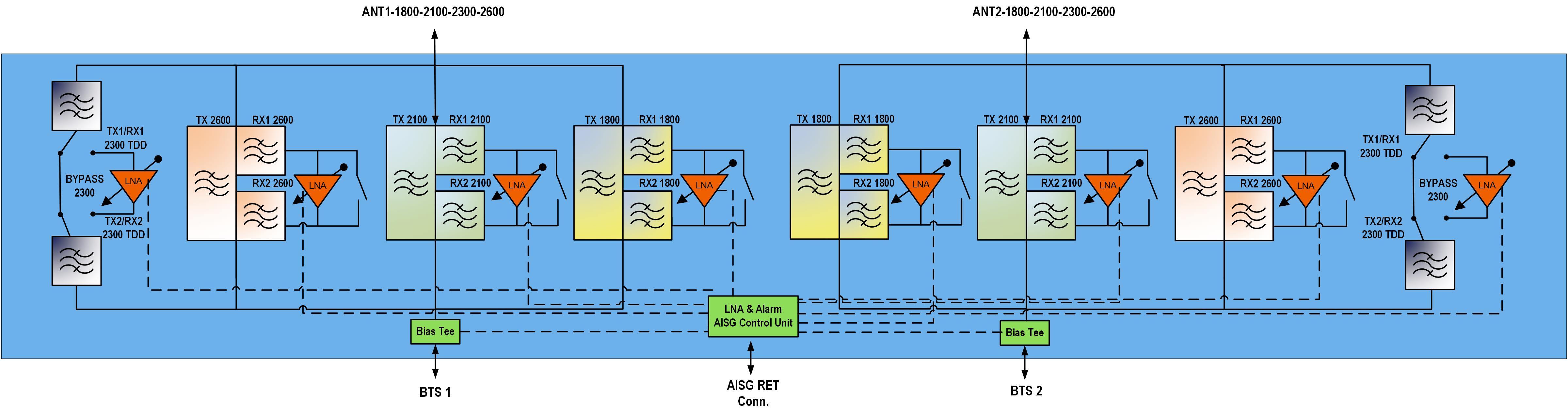 Quad Band TMA 1800/2100/2300/2600, 1 AISG, 4 devices - 2 subunits, with 4.3-10 connectors