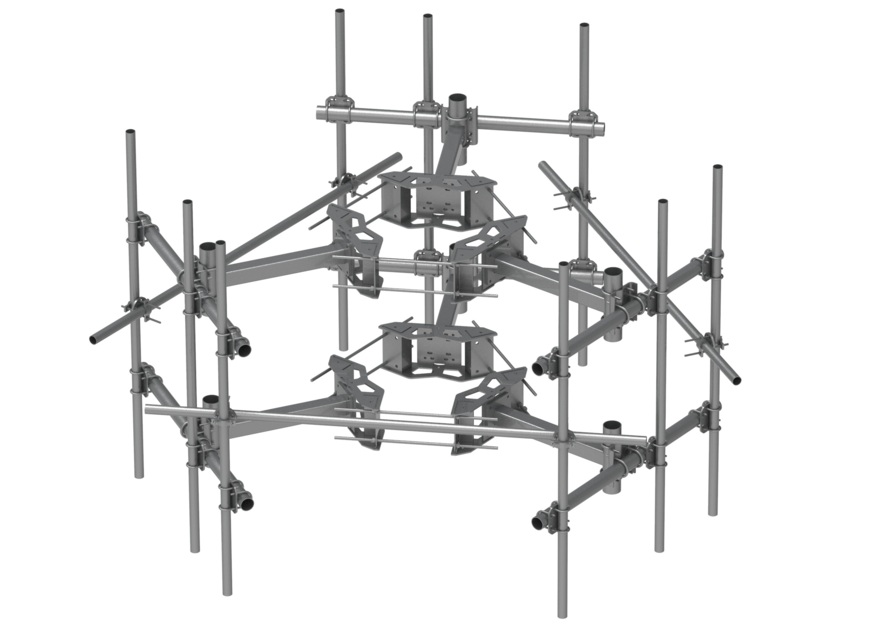 Three-Sector Double T-Arm Monopole Mount, Includes (2) Ring Mounts for 15"-50" OD Monopole, 6 ft x 3-1/2" OD face pipes, (9) 2-3/8" OD x 96” Antenna Pipes